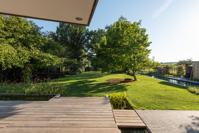 Het zwembad, de terrassen en de boomhut sluiten naadloos op elkaar aan in dit ontwerp. Geen opvallende kleuren of materialen. Wel bomen, struiken en houtsoorten die het natuurlijk karakter van de tuin versterken. Op die manier blijft de oorspronkelijke charme volledig intact.
